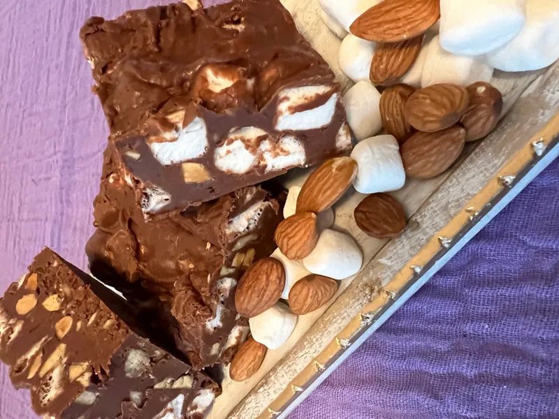 Indulge in the heavenly delight of Rocky Road Fudge! Experience the perfect blend of premium Callebaut 65% dark chocolate, carefully roasted almonds, and delightful mini marshmallows.