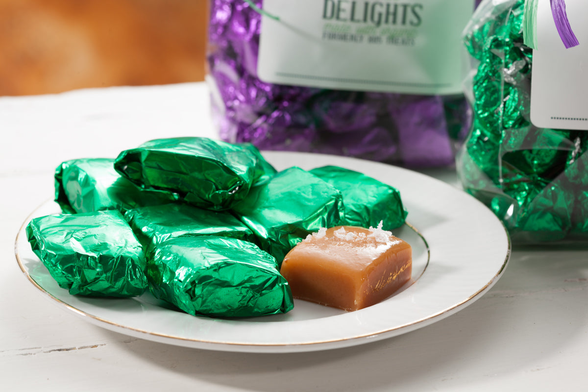 Standard Sea Salted Honey Caramels will be wrapped in green foil, Lavender in purple, and Chocolate in silver unless otherwise requested. If you would like to request a custom foil color, please put it in your order notes. Color wrapper options include: red, orange, gold, green, sage, dark blue, light blue, purple, wildberry, pink, silver, white, or black (pictured left to right below).